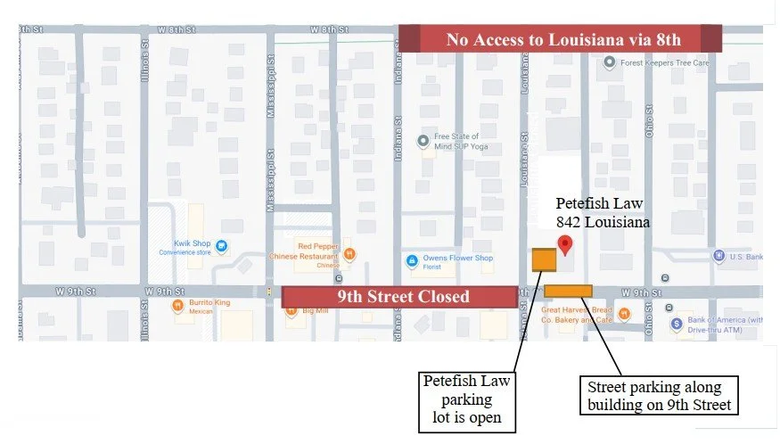 With construction closures on both 9th Street and Louisiana, approach the office from the east via 9th Street. Louisiana Street is now partially open at 9th Street and you can now access our parking lot. Parking is also available along the building in the reserved parking (yellow signs) on 9th Street.