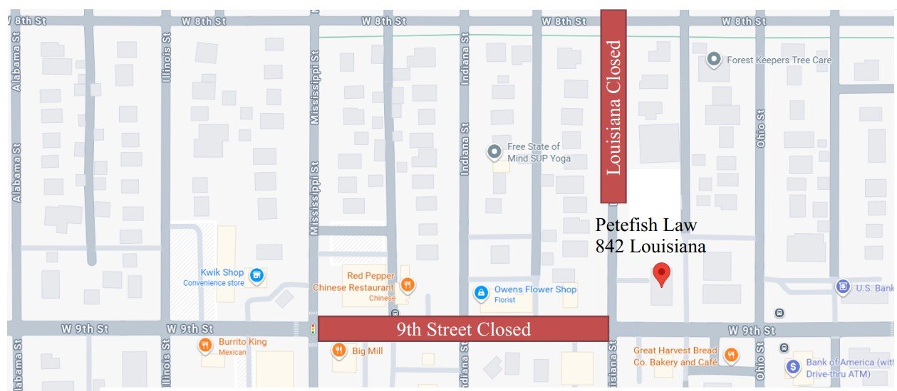 With construction closures on both 9th Street and Louisiana, approach the office from the east via 9th Street. The current closures allow access to our parking lot off Louisiana Street.
